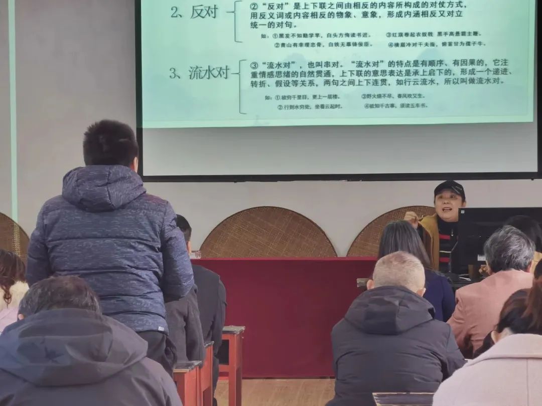 在活动现场,赖俐华老师与基层工作者、书法爱好者、以及从事传统文化的坚守者们一起,相互交流、相互切磋。在讲座中赖俐华老师采取理论与名作欣赏的方式进行教学,归纳了楹联的起源、要素及其影响和作用,总结了楹联书法的基本创作规律和基本应用范式。学员们表示通过这次专业的学习,收获颇丰,对楹联书法的意义和内涵有了更深层次的认识,为今后的楹联书法创作厘清了思路,又一次被传统文化的魅力所震撼,坚定了弘扬传统文化的自信心。