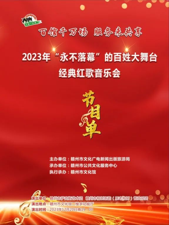 为全面贯彻落实党的二十大精神和习近平总书记考察江西重要讲话精神,坚持以人民为中心的发展理念,不断丰富和满足人民群众文化新需求,12月20晚19:00,“百馆千万场 服务来共享”2023年“永不落幕”的百姓大舞台经典红歌音乐会将在赣州市文化馆二楼多功能厅举行。