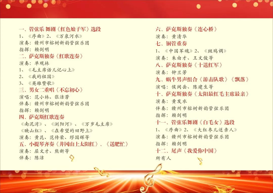 本场演出将为大家奉上《红色娘子军序曲》《映山红》《十送红军》《怀念战友》《红歌六重奏》《井冈山上太阳红》《不忘初心》《红军渡长征源》等经典红歌。届时,欢迎广大市民朋友现场观看。