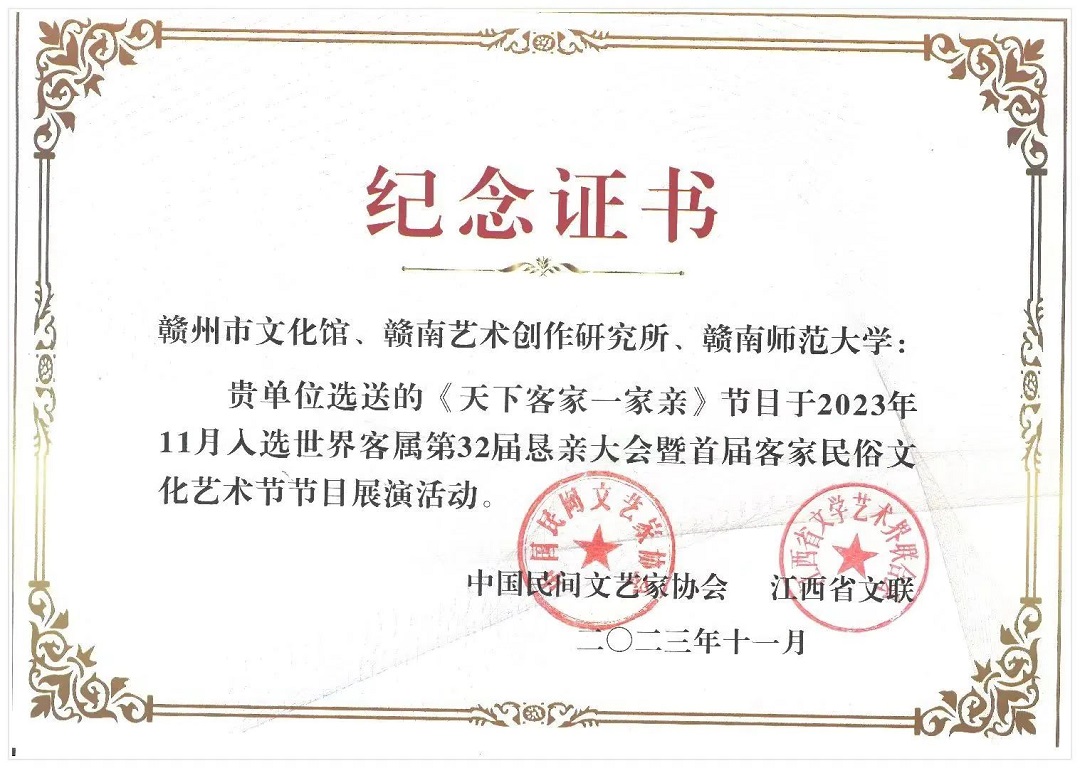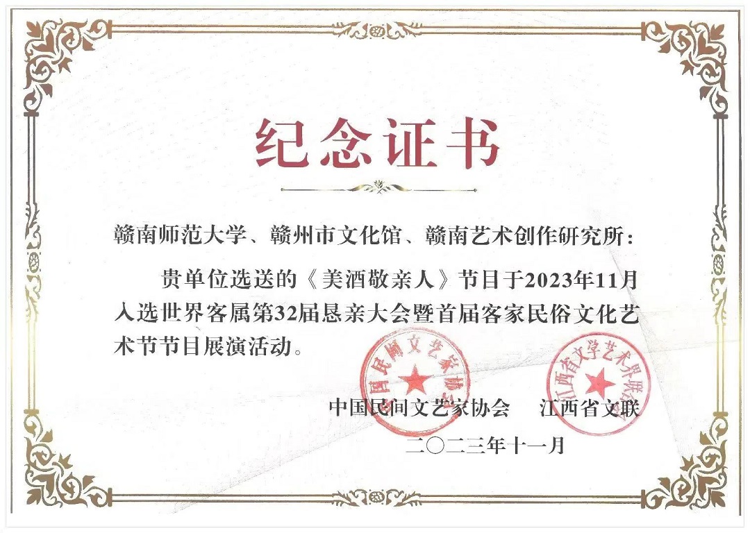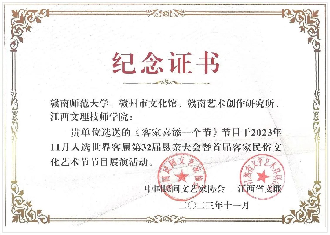由赣南师范大学、赣州文化馆、赣南艺术创作研究所、江西文理技师学院选送的《客家喜添一个节》《美酒敬亲人》节目,为我们揭开和展示沿袭已久、积久成习的极富情趣的客家社会风情、客家生活长卷。