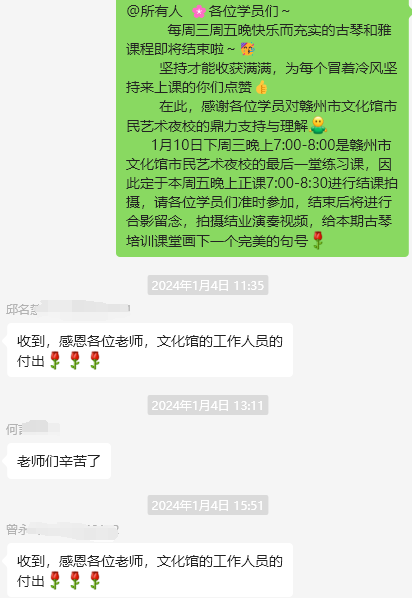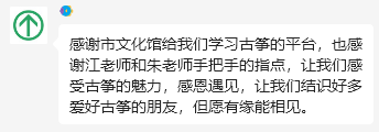 “总说音乐是治愈系的,有幸遇见非遗古琴,能够怀着一份热忱去学习!非常开心能够参加本次古琴和雅班的课程,虽然只有10节课,但学到的知识远远不止。不仅有细致的乐理讲解,也有手把手的弹琴指导,无论有没有基础,都能在课上一起学习,一起进步。感谢老师耐心认真的教导,不厌其烦,手把手的培训是对学员的一种鼓励和牵引,并且让我们领略了吉他弹唱在艺术世界里如此唯美而舒畅,让初学古琴的我们都爱上了它,加深了对音乐的理解。希望夜校的课程能长久地开设下去。”