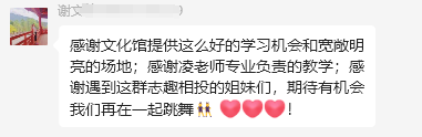 “时间过得飞快!转眼间jazz舞蹈课就已经结束了,在这次的课程里,认识了很多小姐姐们,大家的上课状态都满满的正能量,并充满激情,课堂上也充满的活力,大家都非常的积极。大部分姐姐们都能练出要求的一些技巧,被姐姐们的毅力和信念所折服!发自内心地觉得咱们这个团队真的好棒!”