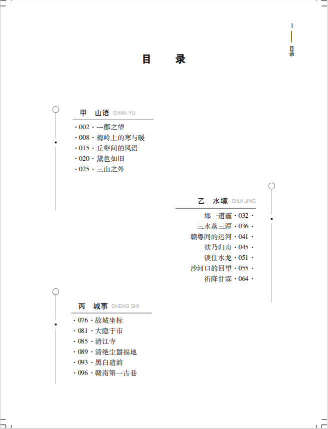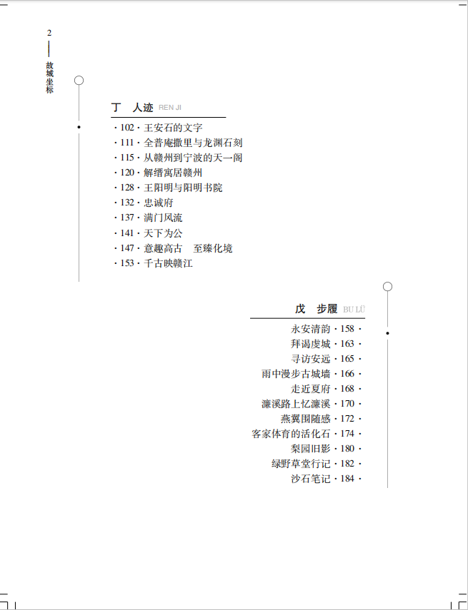 散文集《故城坐标》,全书共分“山语”“水境”“城事”“人迹”“步履”五个部分,作者旨在用散文的笔调来书写赣州历史风物的变迁,以文学与史学相结合的方式,用丰厚的文化感悟力,借助散文的笔触,揭示赣州文化巨大的内涵。