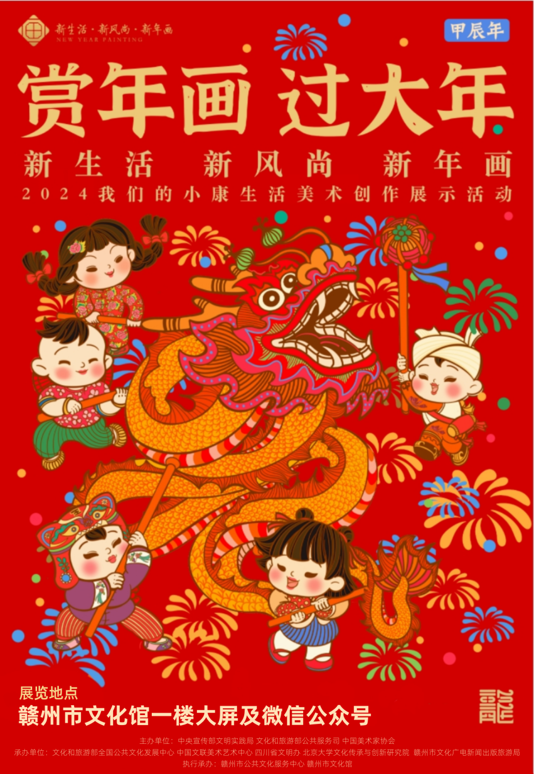 近日,中央宣传部文明实践局、文化和旅游部公共服务司、中国美术家协会举办了2024年“新生活•新风尚•新年画”——我们的小康生活美术创作展示活动。本次展览旨在以习近平新时代中国特色社会主义思想为指导,深入学习贯彻习近平文化思想,传承弘扬中华优秀传统文化,丰富人民群众精神文化生活,激励全市广大群众振奋精气神、共创新生活。这些大红大黄大蓝明艳的色彩,这些生动可爱富有活力人物造型,祝福新年、吉祥喜庆,不仅给互联网时代的我们带来美的享受,也呈现出我们中华民族传统文化的博大精深,激励着新时代的我们为更美好的生活努力奋进!赣州市文化馆现推出“新生活·新风尚·新年画”主题作品线上展览,精选来自全国各地的新年画作品,为大家献上年味儿满满的文化盛宴和新春祝福。