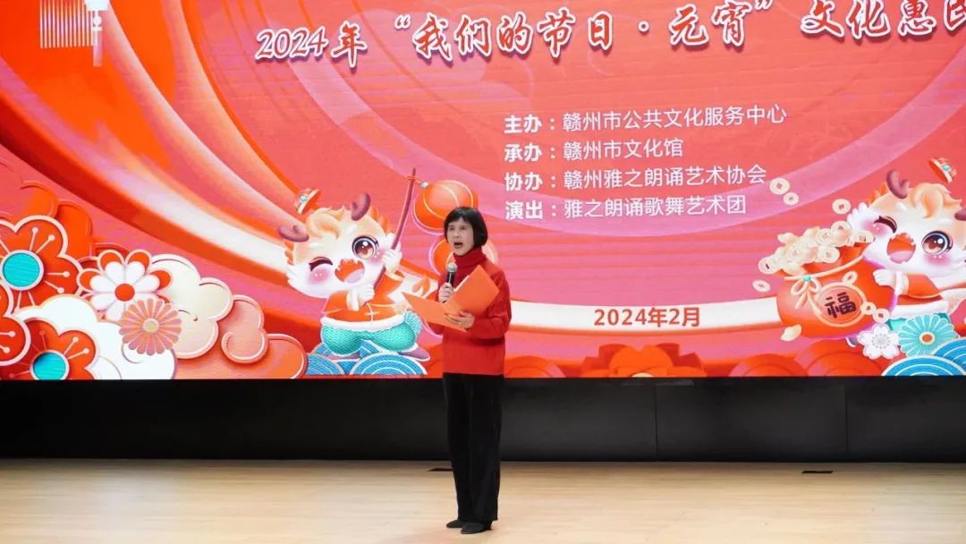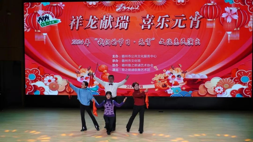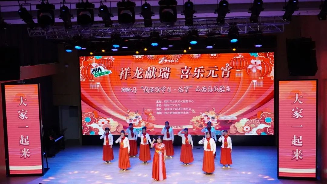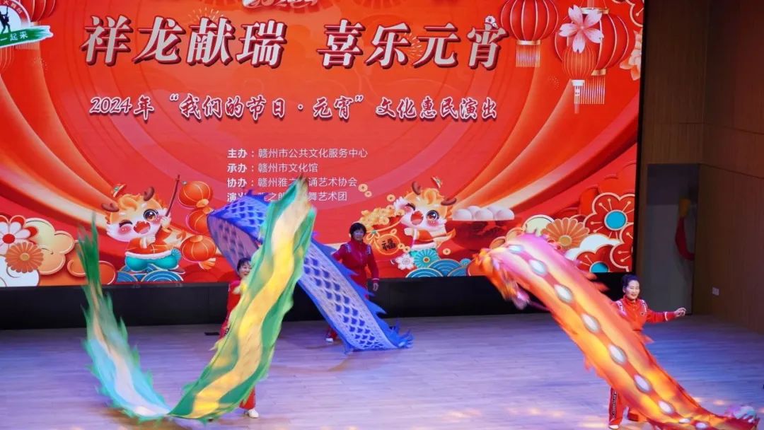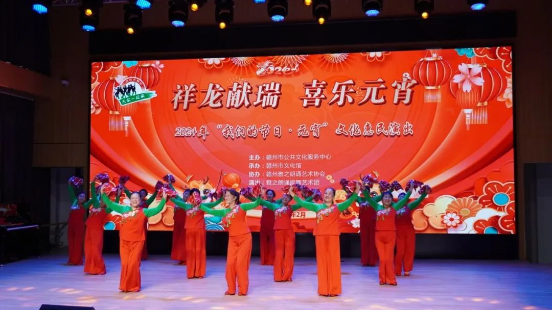 火树银花元夕夜,彩灯万盏熠霞流。为进一步丰富群众的精神文化生活,营造欢乐祥和的节日氛围,提升群众的幸福感与获得感,2月23日,由赣州市公共文化服务中心主办、赣州市文化馆承办、赣州雅之朗诵艺术协会协办,雅之朗诵歌舞艺术团演出的“祥龙献瑞 喜乐元宵”——我们的节日·元宵文化惠民演出在赣州市文化馆群星剧场成功举办,共有约300名群众参与本次活动。