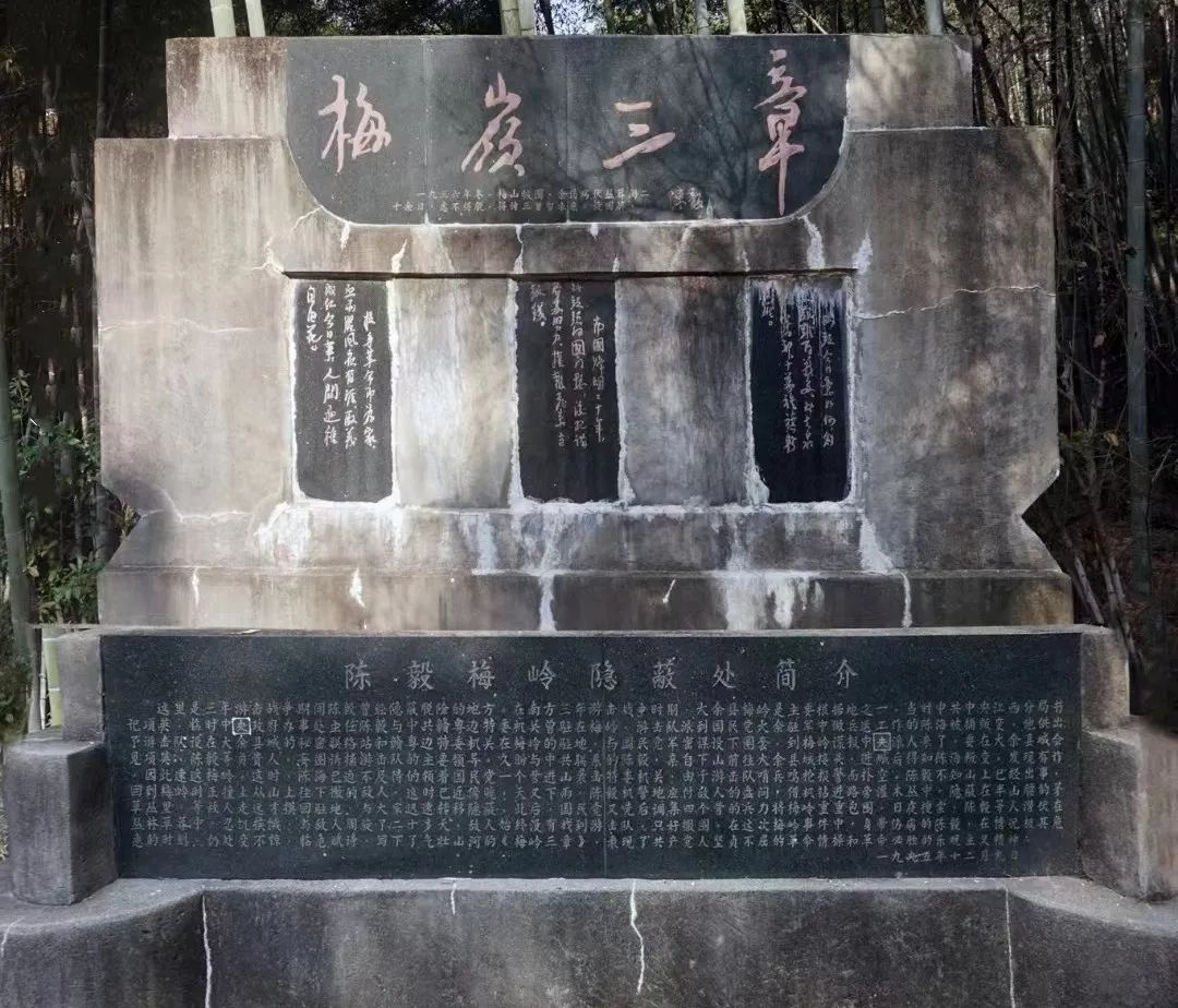 1934年10月,中央主力红军长征后,留在苏区坚持斗争的红二十四师和地方武装共1.6万人遭到国民党四十六师残酷围剿,大部损失。何叔衡、毛泽覃等党和红军的高级干部在突围中牺牲,瞿秋白和刘伯坚被俘后遇害。敌人占领中央苏区后,残酷杀戮革命干部和群众。突围出来的少数部队会同地方武装和敌人打起了游击。陈毅因为在兴国老营盘战斗中负重伤,未能参加长征,于1935年2月来到了位于赣南的油山地区和梅岭,在敌我力量极其悬殊的情况下,开始了艰苦卓绝的三年游击战争。1936年冬,陈毅旧部陈海叛变,引诱陈毅等下山。陈毅不知是计,一大早来到县城,当他们距离交通站只有三四十米远时发现了危险,最后在一妇女的帮助下撤回梅岭,潜伏莽丛间二十多天。陈毅为摆脱政府军的围剿搜捕,藏身于斋坑的岩壁丛莽中,在斋坑的一处山坳里用毛竹支撑一个窝棚,高仅1米,面积只有2平方米。窝棚用藤蔓覆盖,一条隐蔽山道迂回即可到达。敌人虽近在咫尺,但终未发现,于是恼羞成怒的放火烧山。陈毅自知难免一死,便写下《梅岭三章》,藏于棉衣内层,以示绝笔。