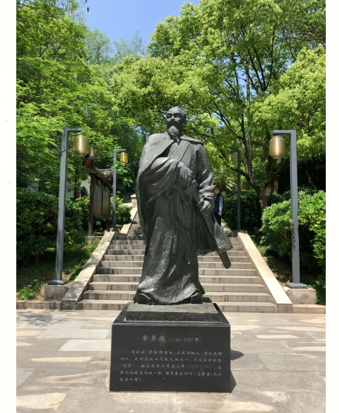 在第六层台阶,矗立着一尊辛弃疾的铜像。他表情凝重,目视远方,左手持剑,右手摁在剑把上,几欲拔剑而出。想必,他此时心头并不是“春风十里”,也不是“烟花三月”,而是在泣血,在为国家的破碎和黎民的流离而泣血。在他的心中,一定在凄楚地反复吟唱:郁孤台下清江水,中间多少行人泪……