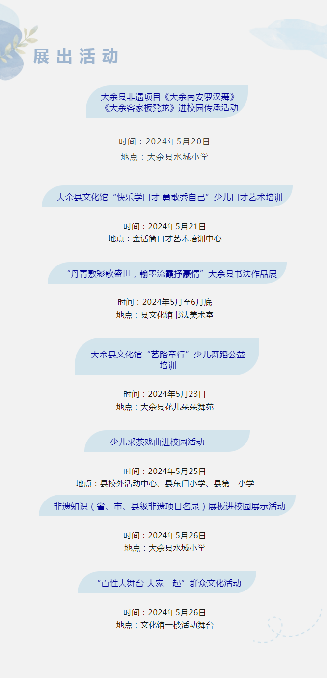 为迎接2024年文化馆服务宣传周的到来,让不同年龄段的人群都能充分享受到公共文化服务资源,大余县文化馆计划开展7场文化活动。这些活动涵盖了书法展览、艺术培训、非遗进校园、群众文艺演出等各类文化活动精彩纷呈,这些活动将大力推广美育教育,弘扬城市文化,以丰富多样的形式让大家感知美学的魅力,激发大家对文化艺术的热爱,同时发挥文化馆对推动公共文化服务高质量发展的重要作用!大余县“文化馆服务宣传周”系列活动即将拉开帷幕:下面让小编一起带大家看看吧~~