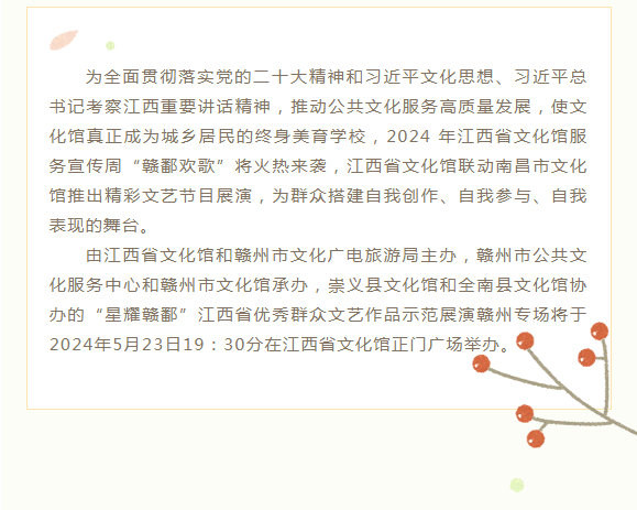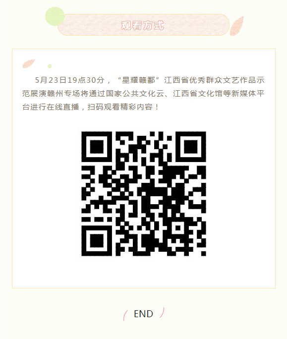 ※ 特别声明:本公众号仅用于赣州市文化馆公共文化服务及群众文化艺术普及,不用于任何商业用途。所转载文章及图片、视频、音频等版权均属原作者。如有侵权,请及时与本公众号联系。