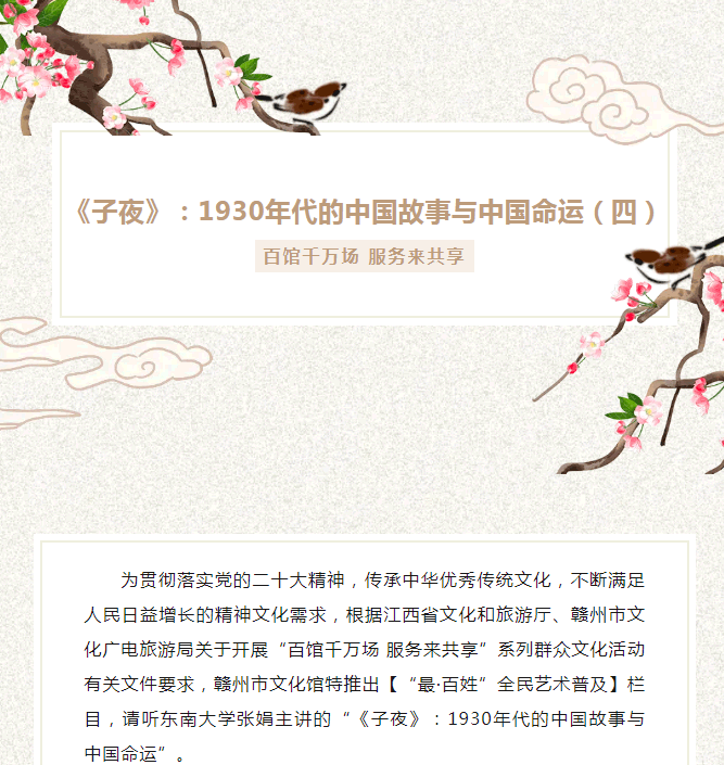 当前位置: 首页 > 文化动态 > 百馆千万场 服务来共享 | 《子夜》:1930年代的中国故事与中国命运(四)