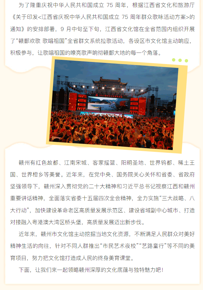 ※ 特别声明:本公众号仅用于赣州市文化馆公共文化服务及群众文化艺术普及,不用于任何商业用途。所转载文章及图片、视频、音频等版权均属原作者。如有侵权,请及时与本公众号联系。