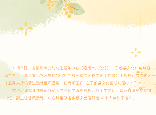 ※ 特别声明:本公众号仅用于赣州市文化馆公共文化服务及群众文化艺术普及,不用于任何商业用途。所转载文章及图片、视频、音频等版权均属原作者。如有侵权,请及时与本公众号联系。