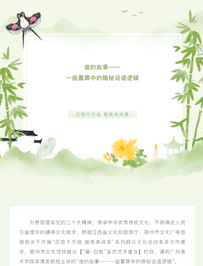 ※ 特别声明:本公众号仅用于赣州市文化馆公共文化服务及群众文化艺术普及,不用于任何商业用途。所转载文章及图片、视频、音频等版权均属原作者。如有侵权,请及时与本公众号联系。