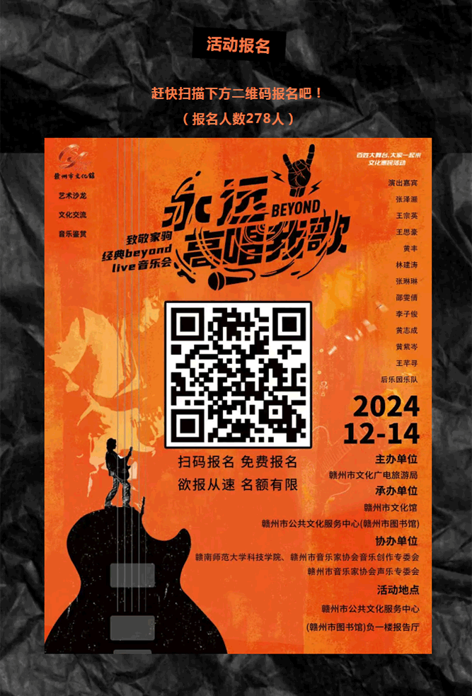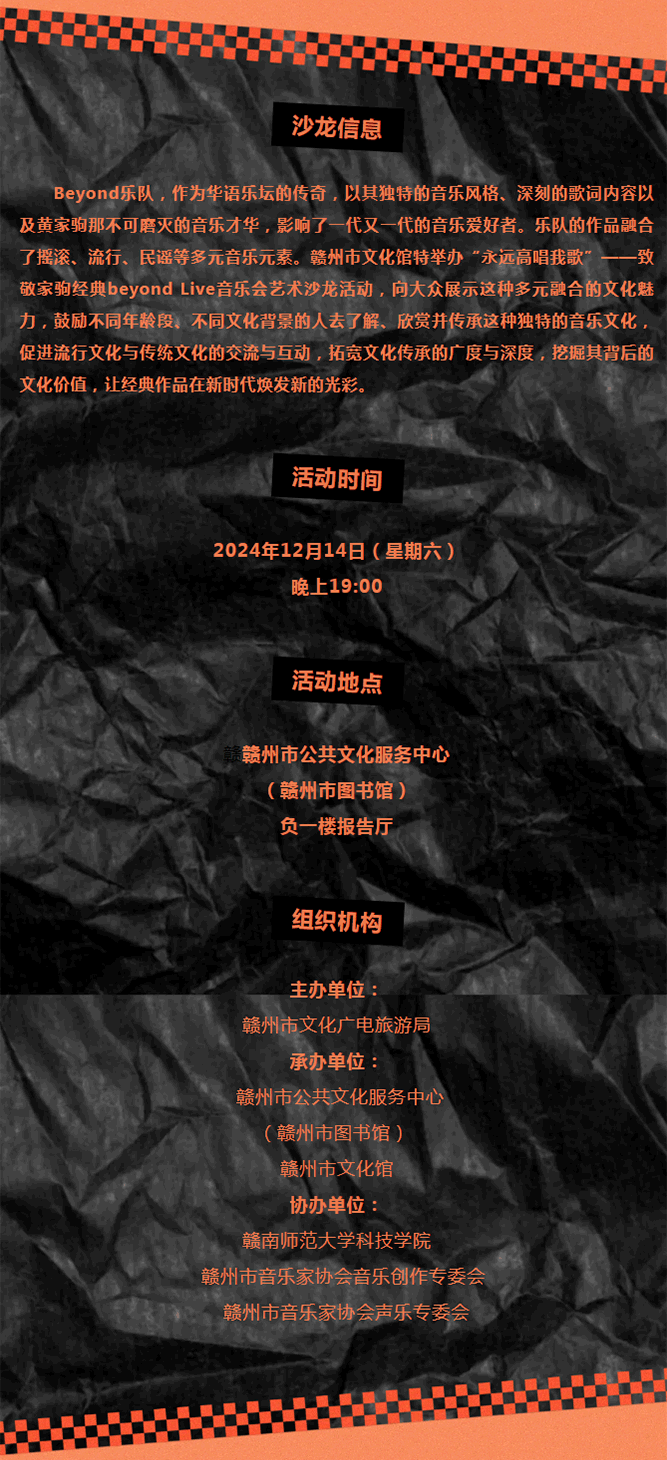 ※ 特别声明:本活动信息仅用于赣州市音乐家协会、赣州市文化馆公共文化服务及群众文化艺术普及,不用于任何商业用途。所转载文章及图片、视频、音频等版权均属原作者。如有侵权,请及时与本公众号联系。