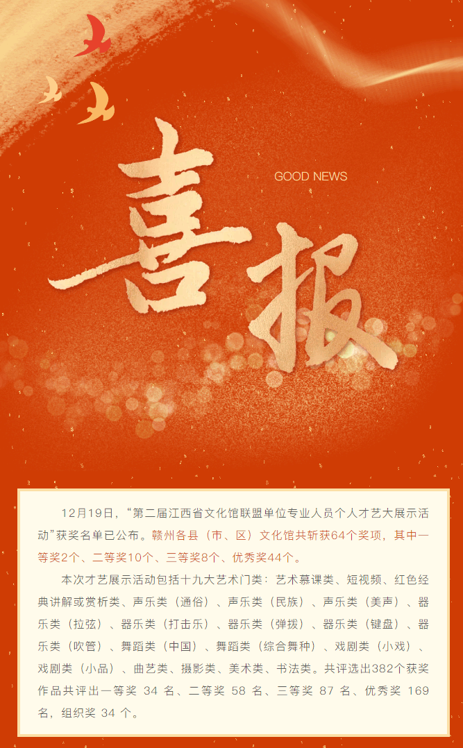 ※ 特别声明:本公众号仅用于赣州市文化馆公共文化服务及群众文化艺术普及,不用于任何商业用途。所转载文章及图片、视频、音频等版权均属原作者。如有侵权,请及时与本公众号联系。