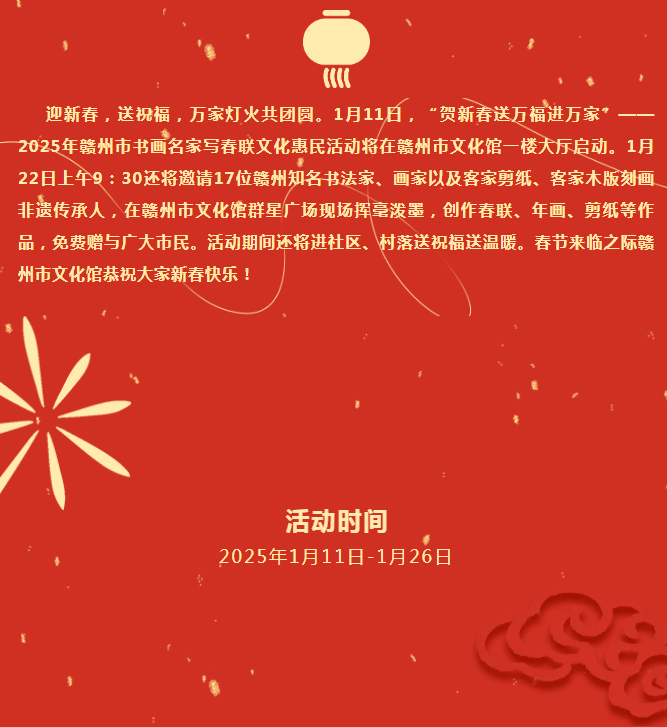 活动预告 | “贺新春送万福进万家”—2025年赣州市书画名家写春联文化惠民活动即将启动