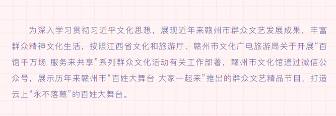 ※ 特别声明:本公众号仅用于赣州市文化馆公共文化服务及群众文化艺术普及,不用于任何商业用途。所转载文章及图片、视频、音频等版权均属原作者。如有侵权,请及时与本公众号联系。