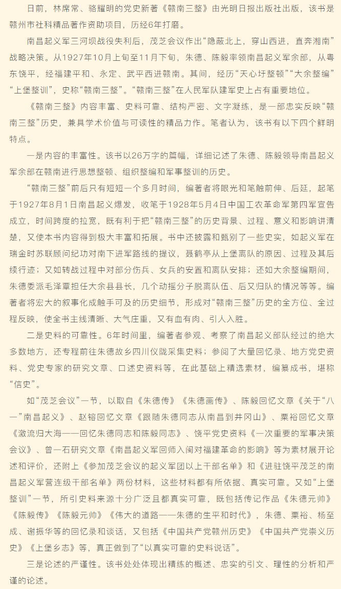 群文者说 | 忠实反映“赣南三整”光辉历程——读林席常、骆耀明党史新著《赣南三整》