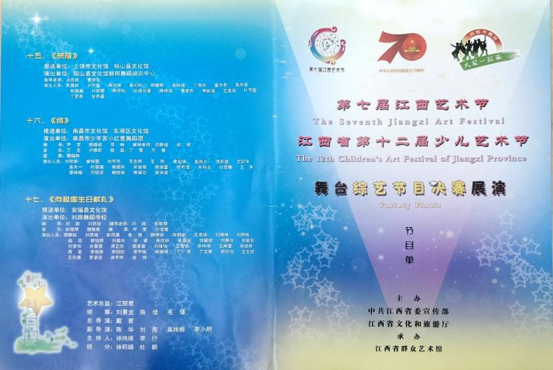为贯彻落实省文化和旅游厅《关于印发<第七届江西艺术节·江西省第十二届少儿艺术节实施方案>的通知》精神,根据市委宣传部、市文广新旅局、市教育局《关于举办全市“礼赞中华”少儿艺术大赛的通知》要求,赣州市文化馆于今年6月份开展了全市“礼赞中华”少儿艺术大赛。截至7月中旬,各县(市、区)共报送了少儿舞台综艺类节目99个。赣州市文化馆于8月1日组织专家对作品进行了评选,共选了5件上报省群艺馆。通过省里复选,章贡区选送的《刘二与四妹》和瑞金市选送的《京腔京韵娃娃情》两个节目被选中,参加第七届江西艺术节·江西省第十二届少儿艺术节的决赛展演。