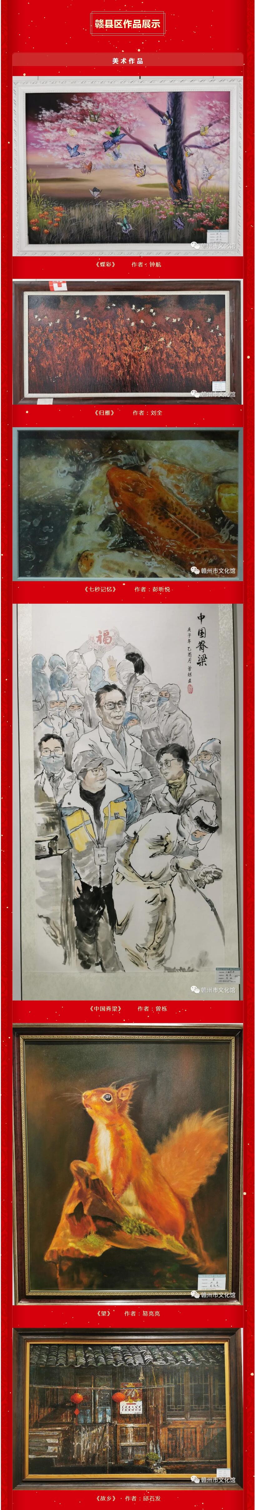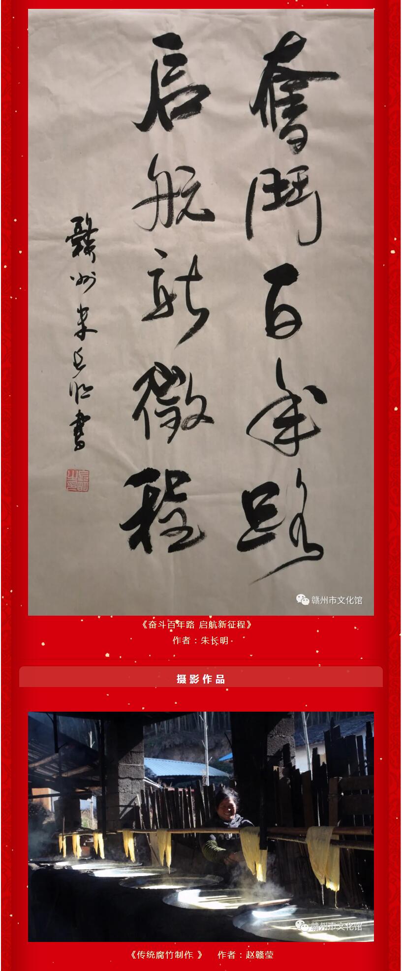 现从中择优整理编辑,美术、书法作品以“百年辉煌 继往开来”为主,摄影作品侧重于“民俗光影 幸福赣州”方面,文学类作品以“我的春节故事”为重点,通过赣南文化云网站、赣州市文化馆微信公众号进行“云展示”。我们站在“两个一百年”奋斗目标的历史交汇点上,观赏这一幅幅、一篇篇、一段段作品时,感悟到人民群众对祖国和家乡振兴发展的赞美之情,更加深刻感受到中国共产党的百年历程和伟大业绩,百年大党的梦想与追求、情怀与担当,从而勠力同心开启新时代的新征程!