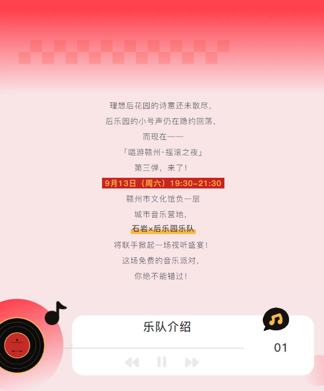 当前位置: 首页 > 文化动态 > 唱游赣州・摇滚之夜 | 石岩后乐园乐队9.13燃爆开唱!免费预约通道9月8日20:00开启