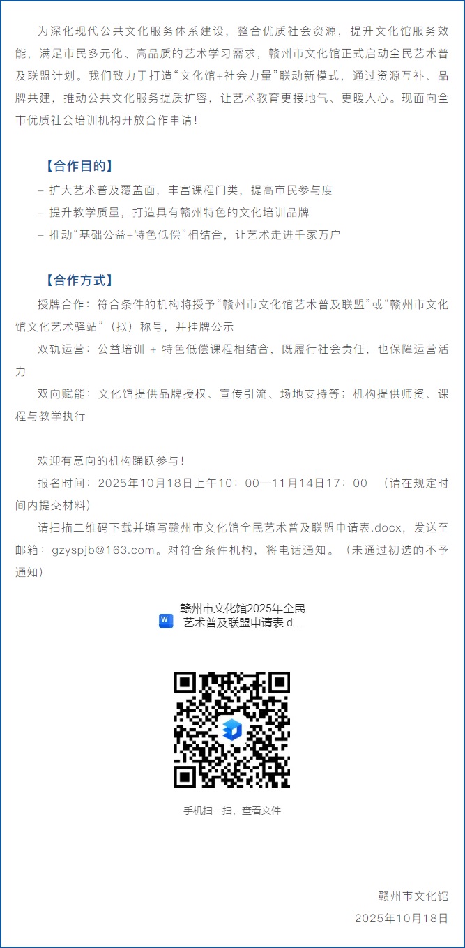 ※ 特别声明:本公众号仅用于赣州市文化馆公共文化服务及群众文化艺术普及,不用于任何商业用途。所转载文章及图片、视频、音频等版权均属原作者。如有侵权,请及时与本公众号联系。