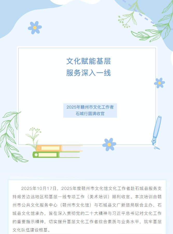 ※ 特别声明:本公众号仅用于赣州市文化馆公共文化服务及群众文化艺术普及,不用于任何商业用途。所转载文章及图片、视频、音频等版权均属原作者。如有侵权,请及时与本公众号联系。