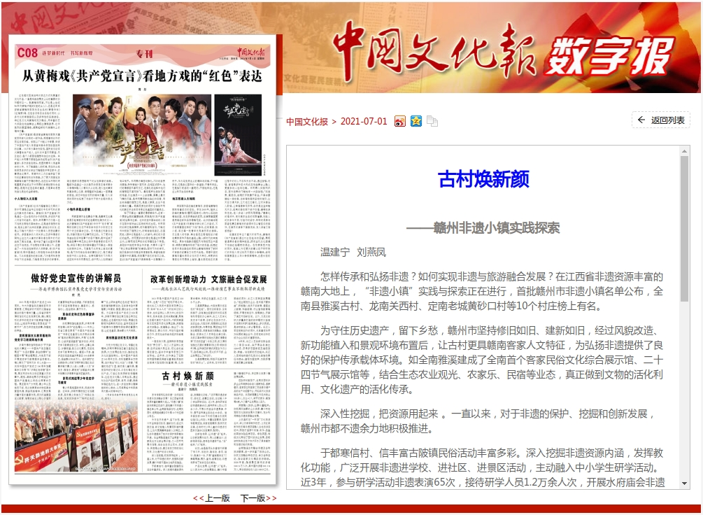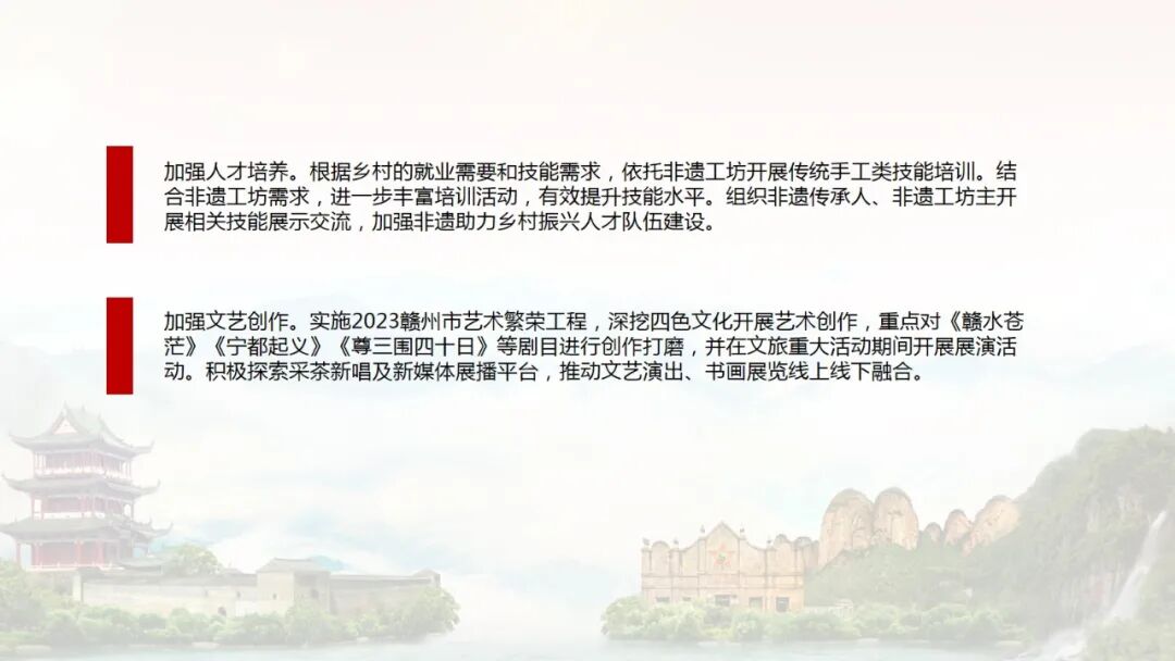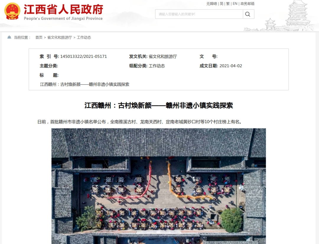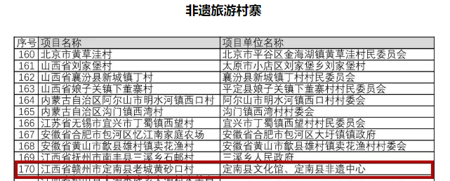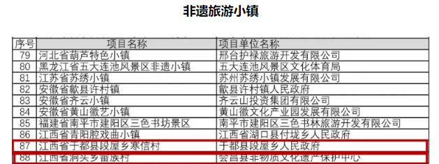 在全省率先启动非遗小镇评选工作,公布10个市级非遗小镇名单。其中于都县段屋乡寒信村、会昌县洞头畲族村、定南县老城黄砂口村三个非遗小镇均列入2022年“全国非遗与旅游融合发展优选项目名录”。