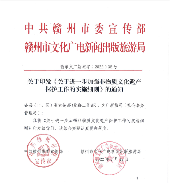 制定出台了《客家文化(赣南)生态保护实验区管理办法》《支持赣州市非遗传承发展措施》等一系列措施,对非遗名录项目和传承人保护进行扶持。