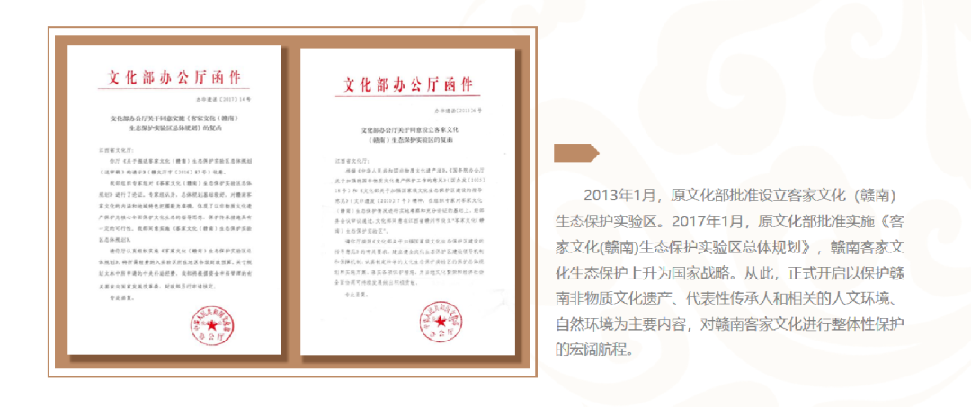 2013年1月,原文化部批准赣州市全域范围为国家级客家文化(赣南)生态保护实验区,赣南客家文化生态保护上升为国家战略。