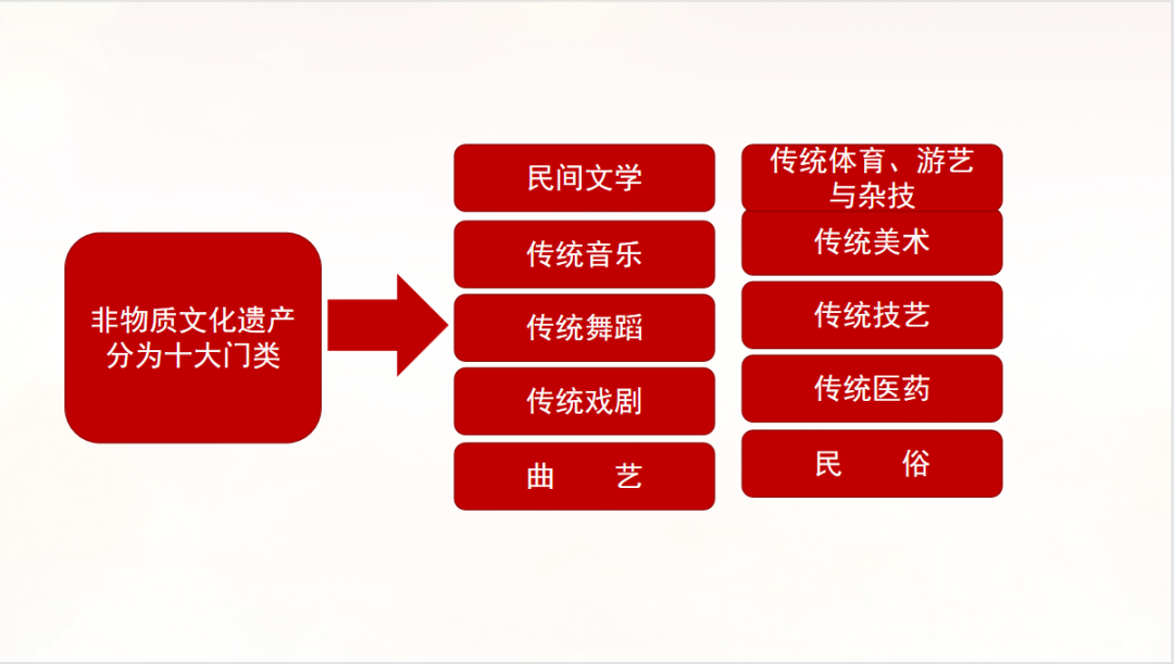 《中华人民共和国非物质文化遗产法》对非物质文化遗产的定义:是指各族人民世代相传并视为其文化遗产组成部分的各种传统文化表现形式,以及与传统文化表现形式相关的实物和场所。