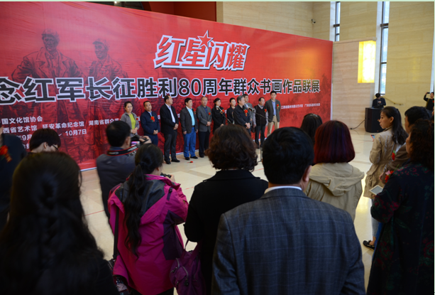 长征是举世无双的壮举,它像一条永远铭刻在地球上的红飘带,赣南是中央红军长征出发地,1934年至1936年,红军从江西省瑞金、于都出发,经过福建、广东、广西、湖南、贵州、四川、云南、青海、甘肃和陕西共11个省,长途跋涉约二万五千余里。红军不畏牺牲,坚忍不拔的革命英雄主义精神是中华民族宝贵的精神财富。为了讴歌红军长征胜利,弘扬长征精神,纪念红军长征胜利80周年,展现出近年来我市群众美术、书法作品创作所取得的新成就,我们在全市征集了美术、书法作品189幅。在征集的作品中,经专家评委评选出41幅美术、书法作品送往陕西省延安市参加由十一个省群众艺术馆联合举办的“红星闪耀一一纪念红军长征胜利80周年群众美术书法联展”。并于 9月30日在延安市革命纪念馆举行了隆重的首展开幕式,十一个省(市)相关领导和专家出席了开幕式。