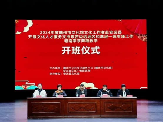 2024年12月6日,由赣州市公共文化服务中心(赣州市文化馆)、安远县文化广电旅游局主办,安远县文化馆承办的“2024年赣州市文化馆赴安远县开展文化人才服务支持艰苦边远地区和基层一线专项工作(赣南采茶舞蹈教学培训班)”在县采茶戏大剧院开班。赣州市公共文化服务中心副主任刘俊,赣州市文化馆工会主席刘鸿英、赣南师范大学音乐学院舞蹈教师、音乐与舞蹈学硕士杨林、安远县文化广电旅游局副局长薛凯、安远县文化馆馆长叶国丰出席开班仪式。开班仪式由叶国丰主持,薛凯致开班辞,刘俊作动员讲话。
